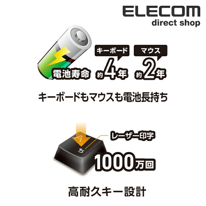 ■キーボード・キータイプ:メンブレン■キーボード・キー配列:92キー(日本語配列)■キーボード・キーピッチ:19.0mm■キーボード・キーストローク:3.5mm■キーボード・電源:単3形アルカリ乾電池、単3形マンガン乾電池、単3形ニッケル水素2次電池のいずれか1本■キーボード・想定電池使用可能期間:アルカリ乾電池使用時の目安 約4年 ※当社テスト値■キーボード・カラー:ブラック■キーボード・外形寸法:幅364.3mm×奥行150.8mm×高さ33.5mm(スタンド含まず)、幅364.3mm×奥行150.8mm×高さ42.0mm(スタンド時)■キーボード・質量:約507g ※電池含まず■マウス・読取り方式:光学式センサー方式■マウス・分解能:1600カウント■マウス・LED色:赤■マウス・ホイール数:1個■マウス・ボタン数:3個 ※ホイールボタン含む■マウス・レシーバ収納:○■マウス・電源:単3形アルカリ乾電池、単3形マンガン乾電池、単3形ニッケル水素2次電池のいずれか1本■マウス・連続動作時間:約384時間■マウス・連続待機時間:約1041日■マウス・想定電池使用期間:約2年 ※1日8時間のパソコン操作中5%をマウス操作に割り当てた場合■マウス・カラー:ブラック■マウス・外形寸法:幅59.3mm×奥行100.0mm×高さ37.8mm■マウス・質量:約57g ※電池含まず■レシーバー・外形寸法:幅19.5mm×奥行15.8mm×高さ6.5mm■レシーバー・質量:約2g■保証期間:6カ月エレコムダイレクトショップタイピングしやすい、JIS規格準拠の標準日本語配列を採用。